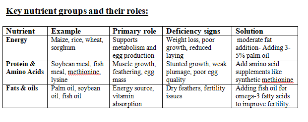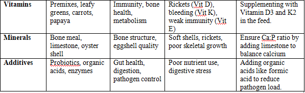 Poultry diets must strike a careful balance between macronutrients (proteins, carbohydrates, fats), micronutrients (vitamins, minerals), and functional additives (probiotics, organic acids).