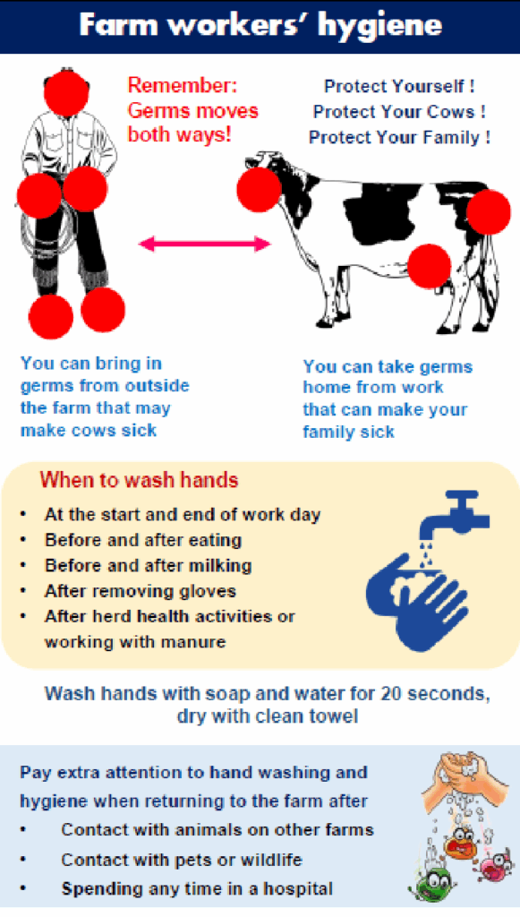 | Animal contacts | Neighboring cattle, cattle returning from show, clinics, wildlife | All contacts must be minimized. Returning cattle are to be considered as ‘’new additions’’ (see above). Calves should be separated in age-groups. |