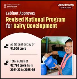• The Union Cabinet approved the Revised National Program for Dairy Development (NPDD) with an additional budget of ₹1,000 crore.