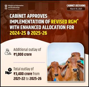 • The Union Cabinet has also approved the Revised Rashtriya Gokul Mission (RGM) to boost the livestock sector, with an additional outlay of ₹1,000 crore.