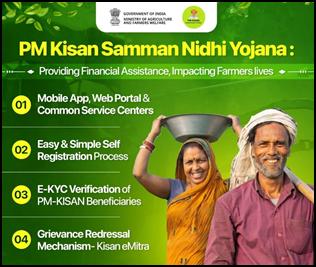 • Pradhan Mantri Kisan Samman Nidhi (PM-KISAN): Launch of PM-KISAN in 2019 an income support scheme providing Rs. 6000 per year in 3 equal instalments. So far, more than Rs. 3.46 lakh crore has been disbursed to over 11 crore farmers through 18 instalments. On February 24, 2025, the government released the 19th instalment of the PM-KISAN scheme. Over 9.8 crore farmers including 2.41 crore female farmers across the country will be benefitted through the 19th instalment release, receiving direct financial assistance exceeding ₹22,000 crore through Direct Benefit Transfer (DBT) without involvement of any middlemen.